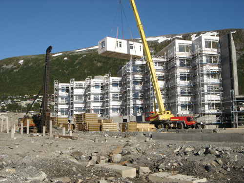Gradilište – Kontejnere je u najvećem broju slučajeva potrebno dopremiti šleperima, a zatim postaviti na mesto uz pomoć mehanizacije (kran ili pokretna dizalica). U poređenju sa klasičnim materijalima za zidanje ovde mora biti korišćena snažnija mehanizacija što dodaje na troškovima.