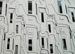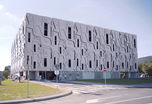 Polazna tačka za projektovanje fasade jeste amaterska fotografija koja prikazuje perspektivni prikaz istorijskih stambenih zgrada u Beču. Ove iskrivljene fasade se množe i montiraju na ravni sa nejasnom tačkom nestajanja. Ova površina se rastvara u četiri sloja ukrojenih čipkastih kompozitnih panela smeštenih na čeličnoj konstrukciji, koji bacaju senke na samu fasadu dajući joj 3D izgled.