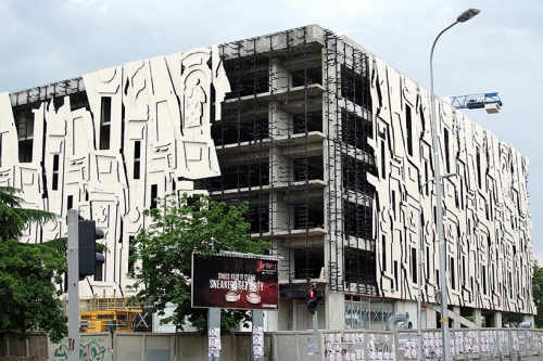 Na konkursu za projektovanje garaže iz 2010. godine, arhitekta Milan Mijalković je u saradnji sa arhitekonskim biroom PPAG Architects iz Beča predao projekat koji suptilno komentariše kontekst projekta „Skoplje 2014“. Projekat nije mogao da pobedi na konkursu, ali je otkupljen od strane Javnog preduzeća i dat gradu Skoplje (navodno, uz pomoć lične intervencije makedonskog premijera kome se fasada projekta jako dopala).