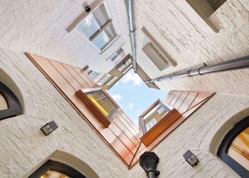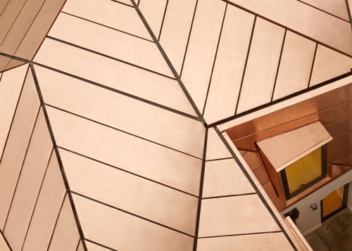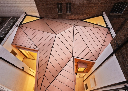 Dinamičan krov napravljen od svetlucave legure od bakra i bronze pokriva ovo proširenje kancelarijskog prostora u okviru para gradskih kuća u Londonu. Arhitektonski biro Emrys Architects je angažovan od strane firme za upravljanje imovinom GMS Estates kako bi modernizovao i proširio njihove kancelarije, koje zauzimaju dve bivše stambene kuće u starom delu Londona.