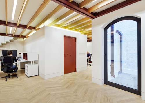 Staklena vrata pomažu u uvođenju dnevne svetlosti u enterijer, a one vode u malo unutrašnje dvorište. Oba sprata novonastale strukture koja povezuje dve istorijske kuće u centru Londona pride odlikuje i odličan hrastov parket koji se nalazi i u postojećim objektima.
