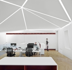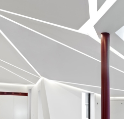 „Uzeli smo postojeće visine ključnih tačaka oko oboda i koristili to za inspiraciju neobične trijangulisane krovne forme“, rekle su arhitekte. Unutra, udubljeno osvetljenje ističe ivice svake ravni, dok trouglasti svetlarnici uvode dnevnu svetlost u prostor iz uglova.