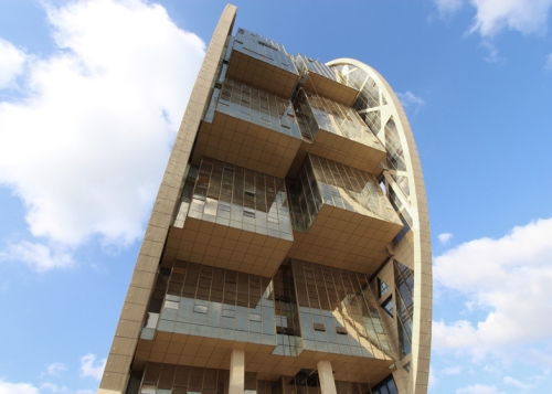 Prednji i zadnji zidovi nebodera su obloženi sa bakarnim pločama, dok su zakrivljeni bočni zidovi podeljeni u zastakljene pravolinijske kutije. Povišene bašte se nalate u centralnoj, probušenoj, površini.