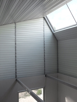 Ugaona struktura poseduje pomaknuti zabat i isečena je sa malim prozorima na južnoj i zapadnoj strani. Upotreba jakog ali laganog talasastog materijala smanjuje pritisak na postojeću spratnu konstrukciju donje etaže.