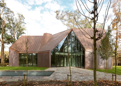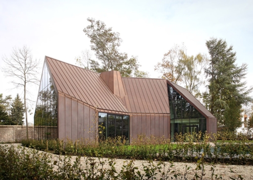 „Želeli smo da integrišemo kuću u šumsko okruženje što je više moguće“, kaže arhitekta Bazil Grauk (Basile Graux). „Bakar nam je dao mogućnost da to uradimo, pošto će kontinuirano menjati boju tokom godina, od zlatne u početku ka plavoj, zatim braon i zelenoj na kraju.“