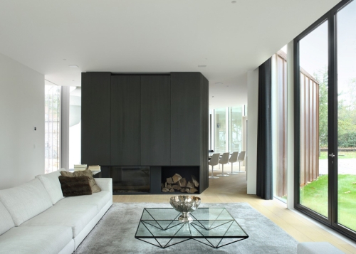 Dva zabatna kraja su u potpunosti zastakljena, kao i dva trouglasta udubljenja duž strana zgrade, od kojih jedno sadrži glavni ulaz u kuću. Porodične sobe kao što je dnevni boravak i trpezarija se nalaze u prizemlju kuće, koje krasi mešavina podova od hrasta i mermera.