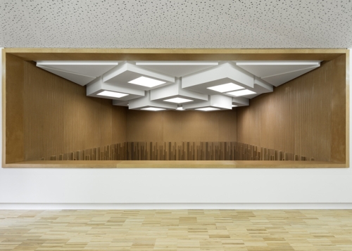 Dugi otvor koji se nalazi visoko na jednom zidu omogućava ljudima na spratu da gledaju na dole u religiozni prostor. Geometrijski obrasci kutijastih svetlarnika kanališe svetlost dana u centralnu sobu, koja je u potpunosti obložena u panelima od drvenih traka koji daju prostoriji topli ton. Drvene obloge karakteriše reljefni ukras koji naglašava visinu prostora i takođe se koristi i u naosu kako bi stvorio privid stubova i luka.