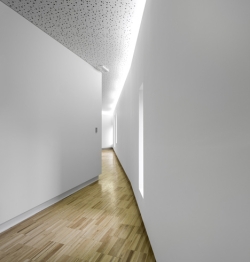 Ulaz na zapadnoj fasadi zgrade vodi do lobija i uskog hodnika koji okružuje centralnu sobu nazvanu Majstorova soba. „Masivni karakter ove zgrade se takođe odražava na dizajnu enterijera i 'iskopanih' prostora, poput niza šupljina oblikovanih unutar velikog kamenog monolita“, objasnile su arhitekte.