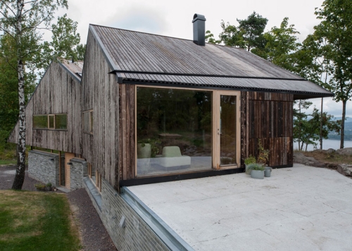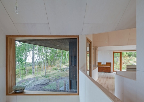 Prozori sa zdepasti ramovima od hrasta pružaju poglede na okolnu šumu i malo dalje na fjordove, dok unutrašnje staklene pregrade pružaju jasne, nesmetane vizuelne linije između nekih od soba.