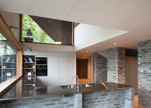 Ista cigla koja je korišćena za fasadu prizemlja pokriva i neke od unutrašnjih zidova i od nje je napravljen bar za ručavanje u kuhinji. Zidovi i plafoni su pokriveni sa zauljenoj iverici od topole, dok podne ploče od belog jasena pomažu u održavanju svetle i vazdušaste atmosfere u enterijeru.