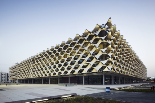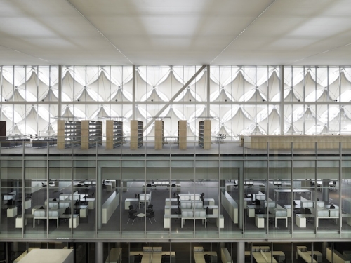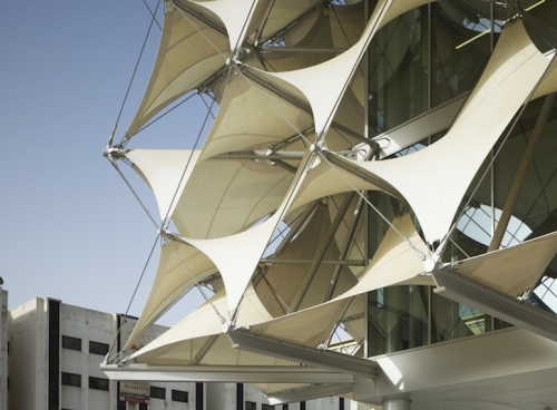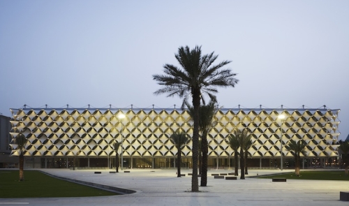 Zakrivljena fasada od belog tekstila se obavija oko nove zgrade Nacionalne biblioteke Kralja Fahada, obezbeđujući vizuelni interes i zaštitu od sunca, zadržavajući maksimalnu penetraciju svetlosti. Svaka membranska tkanina od fiberglasa obložena teflonom je vezana za mrežu prednapregnutih kablova od nerđajućeg čelika, a one su poređene prema tradicionalnom arapskom obrascu.