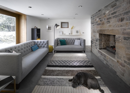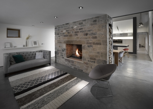 Unutrašnja završna obrada je dizajnirana da ispoštuje iskrenu utilitarnu estetiku starog poljoprivrednog objekat i ona uključuje kamene kamine, prozore sa drvenim okvirima i izliveni betonski pod.