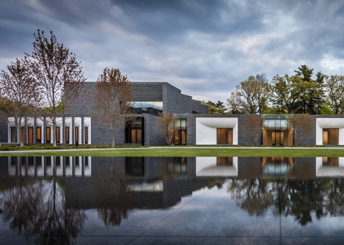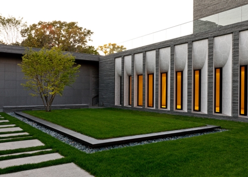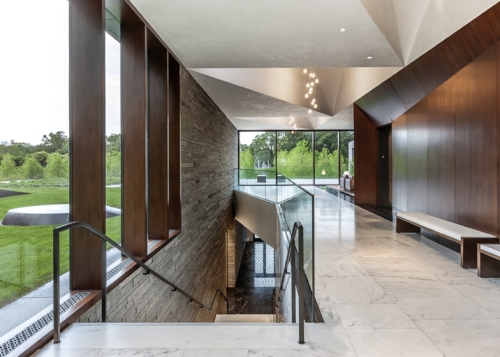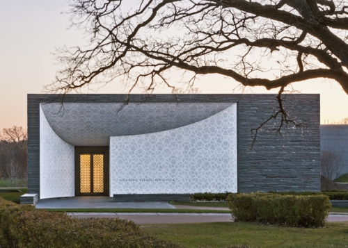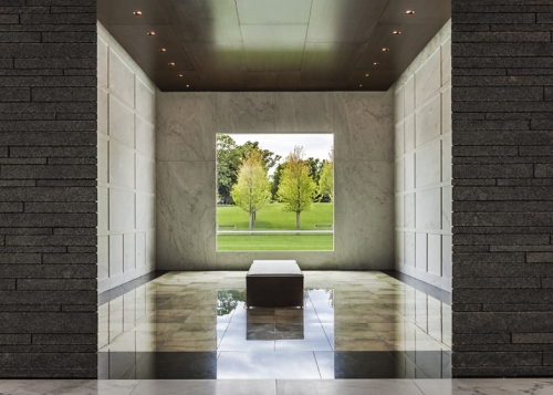 Ornamentalna vrata i prozori se nalaze u udubljenima koja deluju kao da su uklesana u grubim granitnim zidovima ovog mauzoleja u Mineapolisu, delo američkog arhitektonskog biroa HGA.