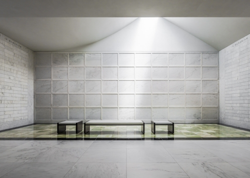Kvadratni ulaz buši zid od granita unutar zgrade, i vodi od glavnog ulaznog dela do niza podzemnih kripti i soba sa kolumbarijumima koji smeštaju kako kovčege, tako i urne. Pravougaoni svetlarnici donose jedan potez dnevne svetlosti u svaku od kripti, dok su sobe sa urnama opremljene sa kružnim krovnim otvorom koji izranja u krovu u centru travnate humke.