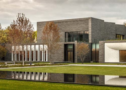 Veći deo strukture je smešteno u stranu brda, omogućavajući da se uredni okolni travnjaci prošire i preko krova. Svi izloženi zidovi su obloženi tamnim blokovima granita koji su u kontrastu sa svetlo belim mozaičkim pločicama koji oblažu udubljenja u njima.
