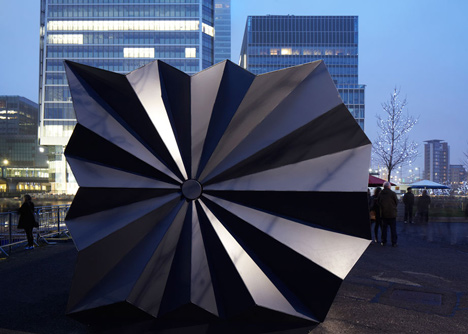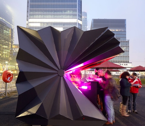 Londonski arhitektonski biro Make je projektova prenosivi prefabrikovani kiosk sa preklopivom aluminijumskom ljuskom koja se otvara i zatvara kao papirna lepeza. Biro Make je zasnovao dizajn kioska na presavijenoj papirnoj formi japanskog origamija, ali je izabrao da ga reprodukuje u metalu kako bi stvorili kompaktnu i robustnu strukturu koja može da udomi ulične prodavce.