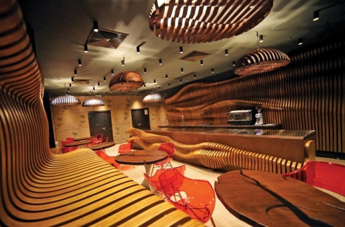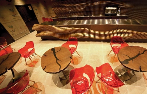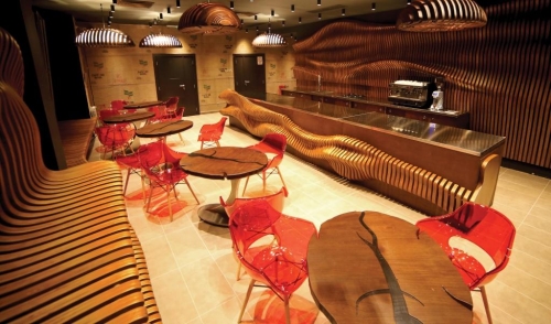 Objekat se sastoji od 1365 komada drveta, koji su svi posebno izmereni, projektovani, isečeni i sastavljeni. Korišćena je paleta zemljanih tonova kao i motivi kafe. Lusteri su napravljeni od šperploče u obliku zrna kafe, kao i stolovi, dok su zidovi dobili organski izgled, te liče na džakove.