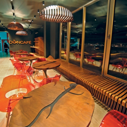 Inspiracija za dizajn potekla je od univerzalne vizuelne asocijacije na kafu – jutene vreće pune svežih zrna kafe. Svi elementi kafića ovaj doživljaj sveta kafe čine potpunim - lusteri i stolovi su u obliku zrna kafe, drveni zidovi odražavaju oblik pakovanja kafe, a prostorom se širi i snažan miris Doncafé Professional espressa. U bojama zemljanih tonova, čitav prostor pruža potpuni ugođaj konzumiranja kafe.