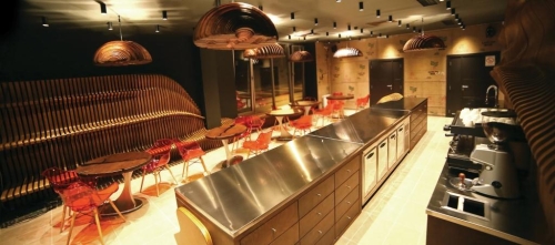 Kako bi posetioci imali utisak da se nalaze unutar vreće kafe, stolovi i viseći lusteri predstavljaju zrna kafe i poređani su asimetrično.