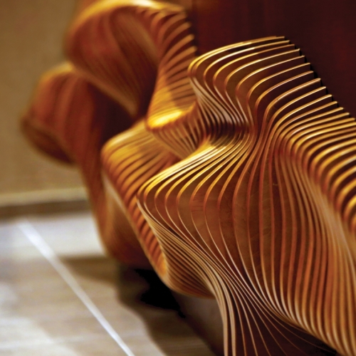 Organski oblik unutrašnjosti jutene vreće ostvaren je zahvaljujući upotrebi komada drveta debljine dva do četiri centimetra, poređanih u formi lamele. Zidovi organskih oblika čine najveći deo objekta i pružaju jedinstveni osećaj sedenja koji se razlikuje od svih drugih u svakodnevnom životu. Njihova funkcija je dvostruka - dekorativna i funkcionalna.