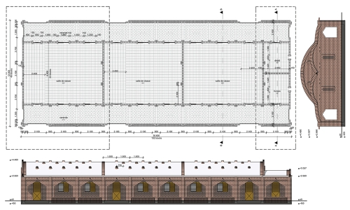 Lučna krovna struktura ovih arkada takođe funkcionišu kao podupirači, pridržavajući težinu glavnog svoda koji se proteže duž centra zgrade. Arhitekte su angažovali studente sa obližnjeg univerziteta i članove lokalne zajednice kako bi pomogli u izgradnji zgrade, koristeći kompresovane glinene cigle za izgradnju podova, zidova i krova.