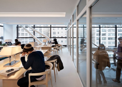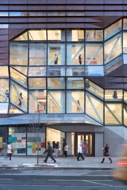 Dinamično betonsko stepenište, koje je vidljivo kroz velike dijagonalne fasadne prozore, spaja niz socijalnih prostora unutar ove zgrade kampusa, delo arhitektonskog biroa SOM za potrebe Nove škole (The New School) u Njujorku.