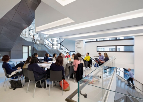 Društvene oblasti, nazvane „sky quads“, smenjuju se u celoj zgradi kako bi obezbedile oblasti u kome nastavno osoblje i studenti mogu da komuniciraju, bez obzira da li se radi o opuštanju između predavanja ili rada na grupnim projektima.