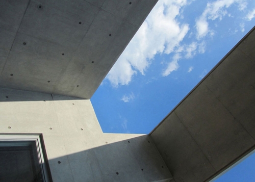 Pravougaoni ram koji okružuje prednju stranu zgrade baca dinamične senke na toenmaru - uski drveni trem kome se može pristupiti iz radne sobe. Slobodnostojeći betonski zidovi označavaju glavni ulaz u kuću, kome se pristupa preko malog kraka stepeništa.