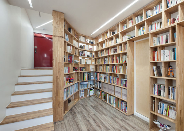 Prostori oko stepeništa su relativno minimalne obične prostorije koje su jednostavne i funkcionalne. One služe da bi ova kuća bila prihvatljivija za odrasle, neka vrsta smirenog prostora u uzburkanom igralištu.