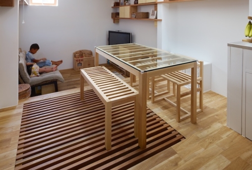 Stub svetlosti se filtrira kroz centar kuće, prolazeći kroz rešetkaste otvore urezane u podove i nameštaj. Beli zidovi, visoki plafoni, kao i velike praznine u prostori stvaraju iluziju obilja prostora u ovoj uskoj kući. Jednostavna paleta boja drveta i bele upotpunjuje minimalistički i savremeni izgled. Stepenište se nalazi na zadnjem delu kuće.