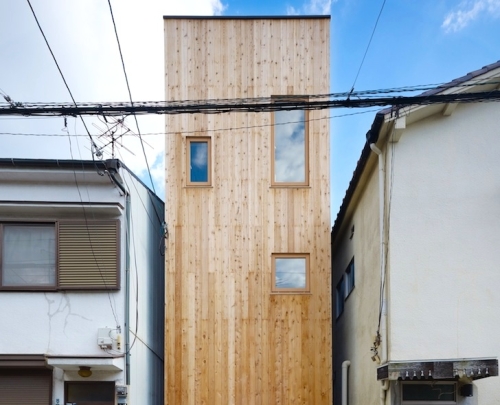 Uska kuća je obložena u drvetu i uzdiže se visoko iznad svojih susednih objekata u stambenom naselju prepunog okruga Nada. Ulazna vrata su povučena u okviru velikog otvora za garažu koji zauzima prednju polovinu kuće.