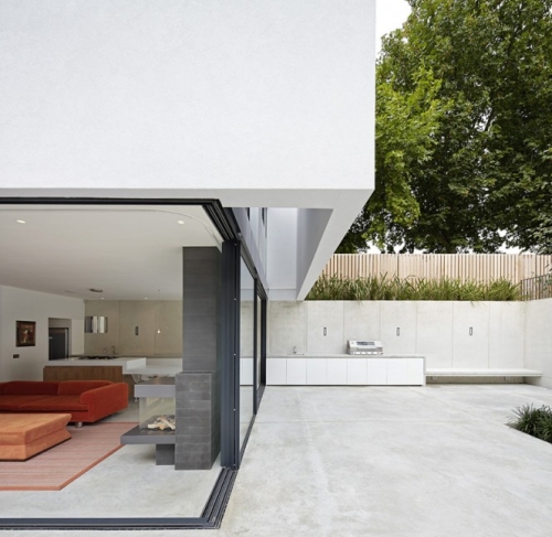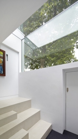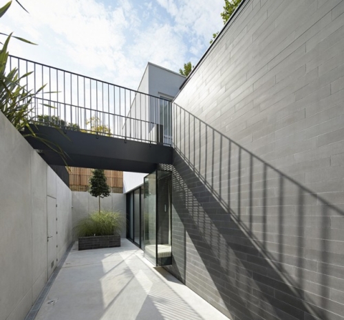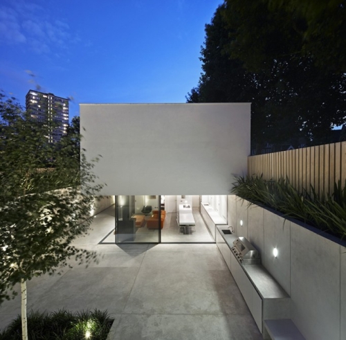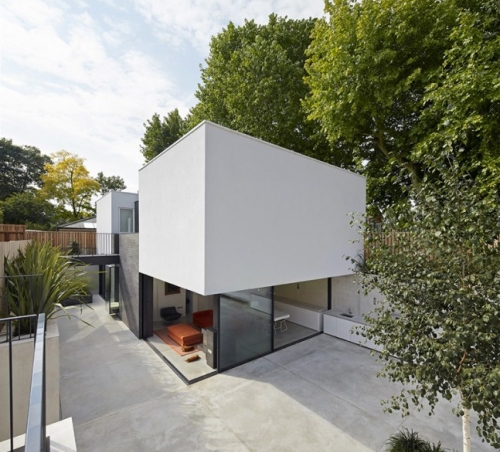 Kuća u svom potonulom belom ambijentu izgleda kao stilizovana modernistička kocka, sa čvrstim belim betonskim volumenom smeštenim lagano preko staklenih zidova prizemlja. Otvoreni prostori u prizemlju se povezuju sa novom dvorišnom površinom, stvarajući veliku otvorenu terasu koja se takođe povezuje sa starom viktorijanskom kućom, sada domom dece tinejdžerskog uzrasta.