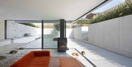 Stakleni zidovi su pune visine uz „otvoreni“ ugao koji je bez nosača, tako da kada se vrata otvore klizanjem u stranu, gornji obim deluje kao da lebdi iznad dnevnog prostora. Plutajuća tema je nastavljena i unutra, gde trpezarijski sto konzolno viri iz kuhinjske radne ploče. Na ovom nivou, staklene površine se mogu videti samo iz privatnog dvorišta.