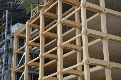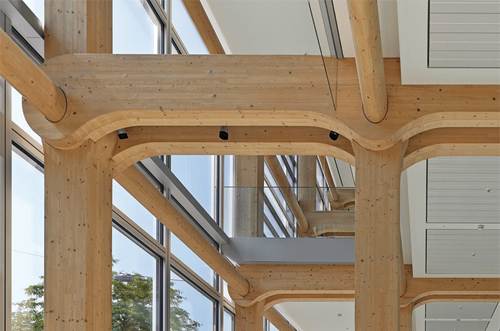 Strukturu karakteriše montažni proces sličan klasičnim sistemima gradnje i odlikuje je sveobuhvatan noseći sistem. Drveni elementi konstrukcije su namerno ostavljeni izloženi. Realizacija ovih arhitektonskih preduslova pomoću lepljenog laminiranog drveta vrhunskog kvaliteta za vidljive elemente i ukršetnih veza proizvedenih sa izuzetnom preciznošću je predstavljala veliki izazov za sve uključene partnere.