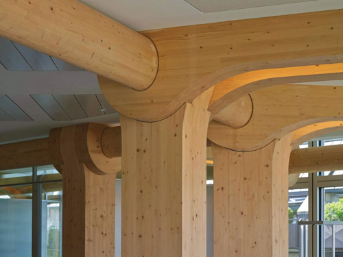Stubovi i udvojene grede su vezane preko zglobova koji imaju specijalno stvorene spojnice napravljene od bukovine. Udvojene grede širine 240mm su napravljene od dva elementa od po 120mm širine. One su dopunjene sa 40mm širokim ovalnim panelima od bukve kao ojačanje duž četiri zgloba lepljene laminirane grede. U nastavku su grede vezane na krajevima. Kao rezultat toga, koncentrisano opterećenje može biti kontrolisano u odnosu na lateralni pritisak. Udvojene grede su povezane sa velikim, ovalnim tiplom od bukve smeštenim u precizno izdubljen ovalni usek u stubu. Dva ovalna panela od bukve ojačavaju umanjeni poprečni presek stuba duž zglobova, omogućavajući kontrolisano uvođenje opterećenja.