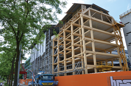 Na uskom gradilištu u gradu, logistika je predstavljala posebno težak zadatak: Postojala je samo jedna vozna traka dostupna za isporuku i skladištenje. Sve isporuke su koordinirane u minut od strane vodećeg izvođača radova. Za drvenu konstrukciju ovakvi uslovi su rezultirali sa do četiri isporuke dnevno tokom vršnog perioda.