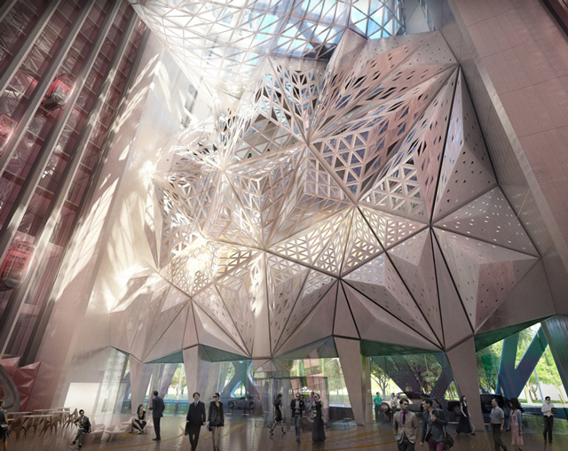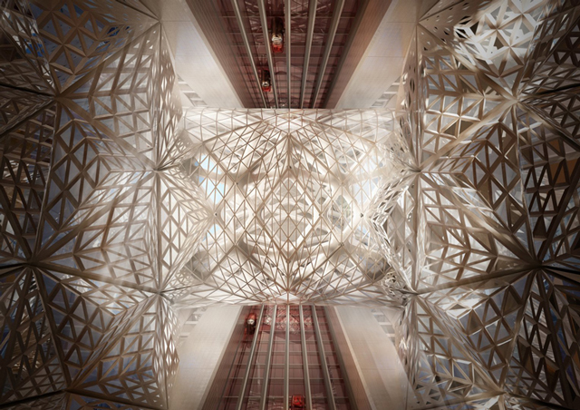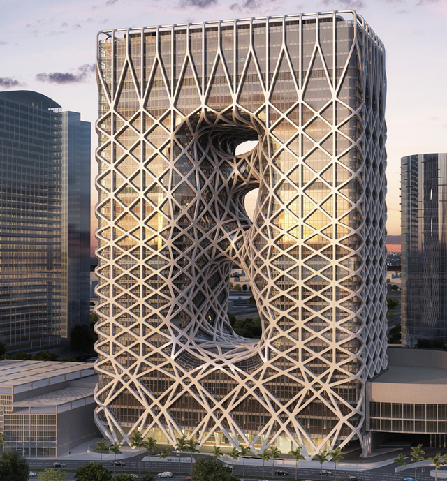 „Pravougaoni obrisi objekta se istiskuju kao monolitni blok sa nizom praznina koji se urezuju kroz centar tornja, spajajući tradicionalne arhitektonske elemente poput krova, zida i plafona kako bi stvorili skulpturalnu formu koja definiše većinu unutrašnjeg prostora hotela“, objašnjavaju u birou Zahe Hadid.