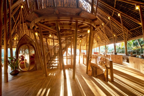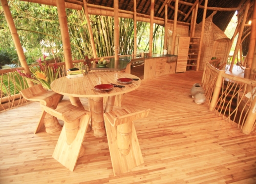 Bambus je korišćen i kao konstruktivni element i kao dominantni element enterijera - zidovi, stepeništa, podovi i namšetaj su takođe izgrađeni od ove biljke. Fleksibilnost bambzsa omogućava stvaranje jedinstvenih formi koje (uz zadržavanje noseće uloge) mogu biti integrisane u prirodne kamene temelje. Razigrana i lagana struktura se povezuje sa prirodnim okruženjem ne uznemiravajući ga.