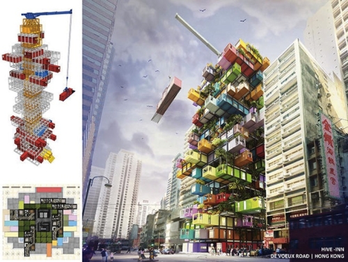 Arhitektonski biro OVA Studio iz Hong Konga projektovao je „Hive-Inn“, koncept hotela čudnog izgleda napravljenog od raznobojnih transportnih kontejnera. Projekat je urađen za potrebe konkursa Radical Innovation Awards Competition 2014, a smela struktura je napravljena od delova koji se mogu menjati u zavisnosti od potrebe hotela.