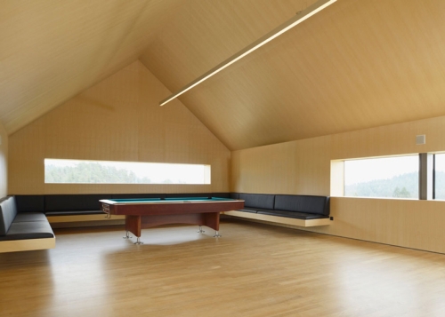 Unutrašnji profil zabatnog krova je ostavljen izložen u delu potkrovlja, koji je obložen istim panelima od jasena kao i u celom enterijeru. Fotografije: Miran Kambič.