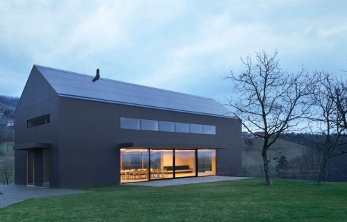 Eksterijer zgrade je projektovan tako da se uklopi sa drugim poljoprivrednim objektima u okruženju, ali uz integraciju novih održivih tehnologija. „Tamna fasada liči na stare drvene štale iz neposrednog okruženja i omogućava diskretnu inkluziju fotonaponskiih panela u osnovni volumen zgrade.“