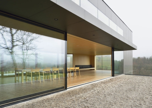 Četiri noseća stuba u uglovima zgrade omogućavaju veliki raspon u prizemlju, koji stvara prostor koji podseća na otvoreni prostor za sušenje u košu. Oskudno nameštena soba poseduje prozore visine od poda do plafona duž tri strane, koji pružaju panoramski pogled i koji se mogu otvoriti na jednoj strani kako bi povezali unutrašnjost sa spoljašnjim travnjakom.