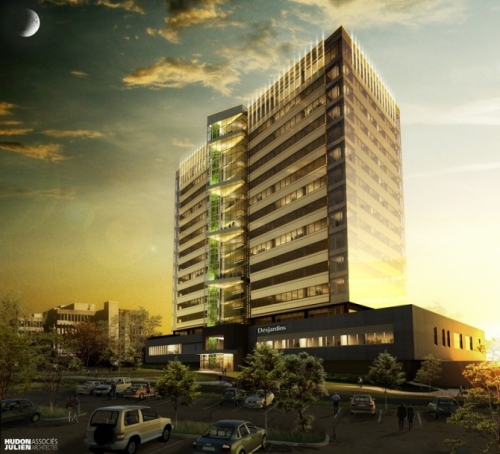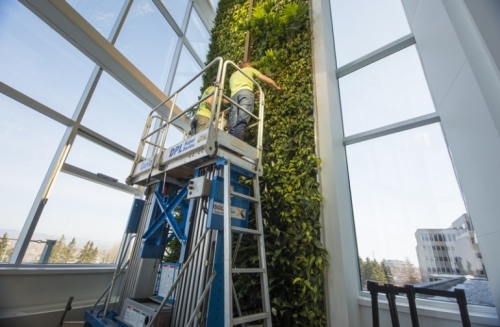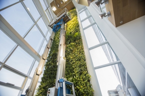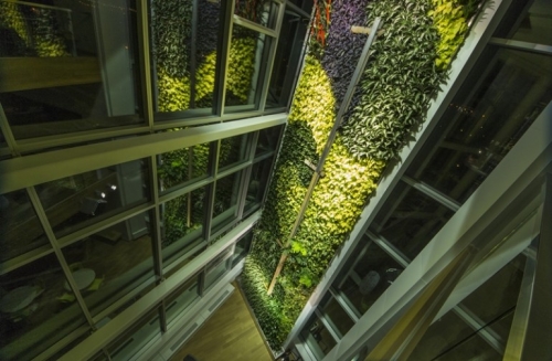 Zgrada ima ekološki fokus i očekuje se da će primiti LEED Gold sertifikaciju po završetku obnove krajem ove godine. Zeleni zid upotpunjuje ovaj ekološki pristup. „Zid je u potpunosti hidroponičan (tj. bez zemljišta) i inkorporira biljke koje napreduju u sličnim vertikalnim sredinama u prirodi, kao na granama drveća i u blizini vodopada“, kaže Patrik Poirod, suosnivač dizajn studija Green Over Grey. „Krajnji rezultat je vizuelno prijatan komada koji obezbeđuje čistiji vazduh u zatvorenom prostoru i poboljšava akustični kavalitet prostora i vrednost imovine.“