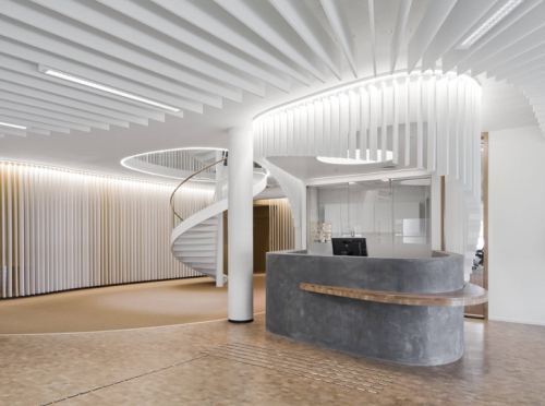 Moderna rekonstrukcija kancelarijskog enterijera podstiče bolje radno okruženje upotpunjeno sa spiralnim stepenicama koje deluje kao i ventilacioni kanal. Jednostavna, ali ipak inovativna rekonstrukcija poslovnog kompleksa Kjobo je odličan primer realnosti izgradnje boljih zgrada koje mogu zadovoljiti svoje energetske potrebe.