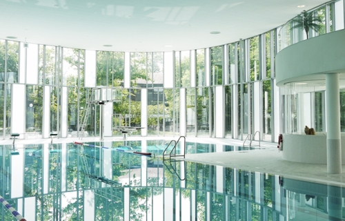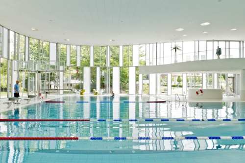 Ovaj novi zatvoreni bazen u Ismaningu, Nemačka, je obavijen u tečnoj staklenoj fasadi koja omogućava prodor dnevnoj svetlosti u unutrašnjost, zamagljujući granicu između spolja i unutra.