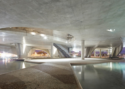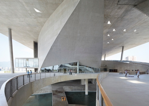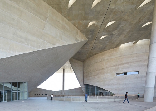 Dve velike horizontalne ploče od betona formiraju osnovni nivo poda i krov kompleksa. One su ispresecane različitim povišenim kutijama, velikim vijugavim lamelama i raširenim stubovima koji uokviruju različite unutrašnje aktivnosti.