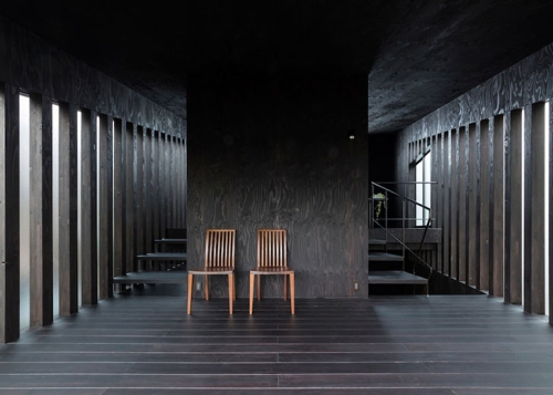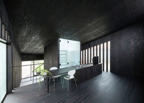 Celokupni enterije je odeven u tamnom drvetu, a stepenište spaja dva sprata i vodi stanare do prohodnog zelenog krova. Iako se kuća nalazi na malom parčetu zemljišta, ona poseduje terasu i baštenski prostor.