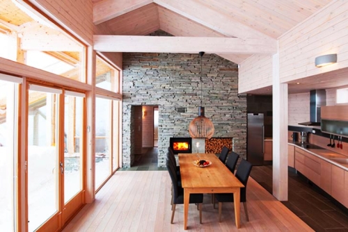 Koliba ima 178 metara kvadratnih površine, a izgrađena je sa kombinacijom od lokalnog kamena i nauljenog norveškog bora, dok njeni mnogobrojni prozori uokviruju zapanjujuće pejzaže i puštaju sunčevu svetlost u svaki ugao. Zahvaljujući nagibu i raskošnim zelenim krovom, ova koliba u planinama deluje nestvarano i uklopljeno sa pejzažom podjednako dobro zimi i leti.