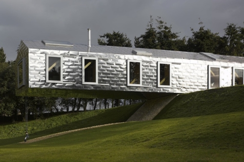 Rustična forma balansirajućeg ambara se poziva na obližnje seoske kuće koje su moderne i smele. Poznat po svojim razigranim projektima, biro MVRDV je prekrio zidove i krov štale sa preklapajućim listovima od nerđajućeg čelika koje iskrvljuju pejzaž i stvaraju iluziju da cela struktura lebdi u vazduhu. Centralno betonsko jezgro stabilizuje konzolni ambar.