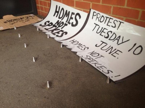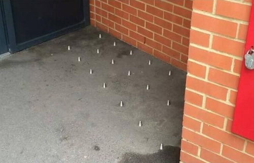 Početkom juna meseca, neko je postavio na internetu fotografiju niza metalnih šiljaka ugrađenih u zemlju ispred londonske stambene zgrade.Ovi šiljci imaju za cilj da obeshrabre beskućnike da spavaju u toj oblasti, a njihovo prisustvo izazvalo negodovanje u javnosti. Londonski gradonačelnik nazvao je šiljke “ružnim, pogubnim i glupim”. Gradonačelnik Montreala zove slične šiljke u svom gradu “neprihvatljivim”. Demonstranti su sipali beton preko gomile šiljaka ispred Tesco supermarketa. Nakon što je potpisana peticija skoro 130 000 ljudi, šiljci su uklonjeni ispred londonske stambene zgrade i Tesco supermarketa, kao i u centru Montreala.